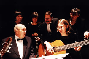 | Transcribe numerosas obras para orquesta de plectro y guitarra de diferentes autores españoles y extranjeros realizando siempre una labor minuciosa de revisión y personalización del repertorio. Cabe destacar su labor en divulgar la música clásica y los autores españoles como Falla, Albéniz o Granados. Adapta también obras del repertorio guitarrístico como obras de Sor, Tárrega o Fortea. ![]() En Laud'Ars junto a algunos de los componentes de la cuerda de guitarras. Foto perteneciente al libreto del primer CD de la Agrupación Ladística Cierzo. En noviembre de 1991 deja el puesto de director musical pero sigue en activo colaborando con la cuerda de guitarras y elaborando y revisando el repertorio de Laud'Ars. ![]() Junto a su hijo Miguel Angel Sánchez, que toma el relevo en al dirección. ![]() 1999. El grupo en su local de ensayo, en Sant Joan Despí. |